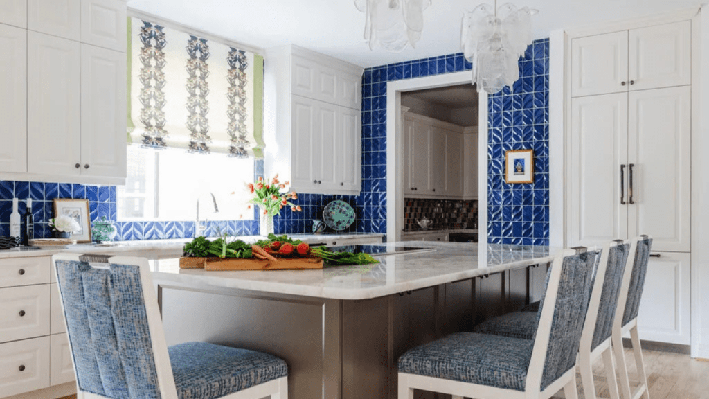 The kitchen featured inset cabinetry painted in a custom slate blue, a full-height marble backsplash, and a grand central island with waterfall-edge countertops and ambient under-cabinet lighting. Storage was seamlessly integrated, including a spice drawer with labeling system, custom utensil dividers, and appliance garages.